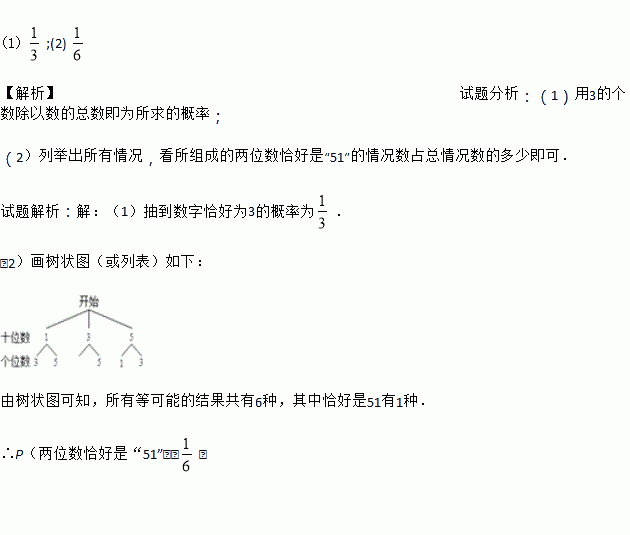 (2)随机抽取一张作为十位上的数字(不放回),再抽取一张作为个位上的数字,通过列表 或画树状图求所组成的两位数恰好是“51”的概率.