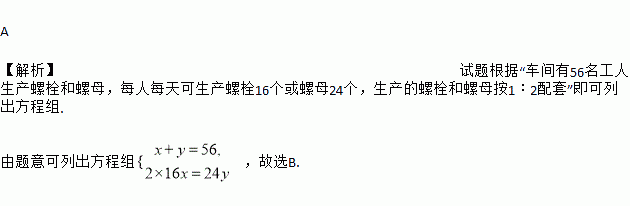 某车间56名工人,每人每天能生产螺栓16个或螺母24个,设有x名工人生产螺栓,y名工人生产螺母,每天生产的螺栓和螺母按1:2配套,所列方程正确的是( )