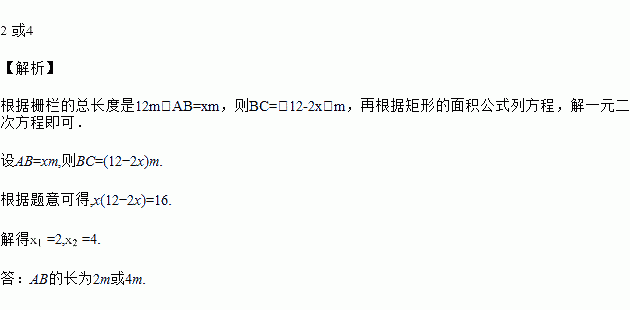 如图,邻边不等的矩形花圃,它的一边利用已有的围墙,另外三边所围的栅栏的总长度是,若矩形的面积为,则的长度是________(可利用的围墙长度超过).