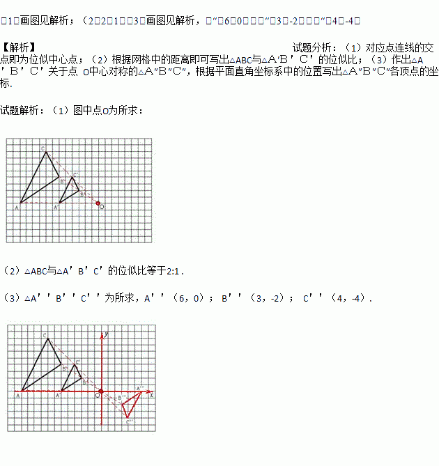 (3)以位似中心O为坐标原点,以格线所在直线为坐标轴建立平面直角坐标系,画出△A'B'C'关于点 O中心对称的△A″B″C″,并直接写出△A″B″C″各顶点的坐标.