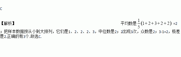 对于样本数据1,2,3,2,2,以下判断:①平均数为5;②中位数为2;③众数为2;④极差为2.正确的有( ).