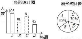 【解析】试题分析:(1)根据A的人数为105人,所占的百分比为35%,求出总人数,即可解答;