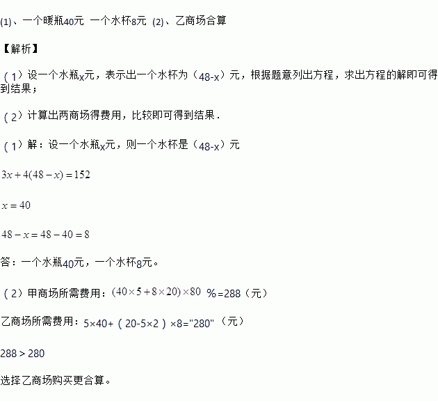 (2)甲、乙两家商场都销售该水瓶和水杯,为了迎接新年,两家商场都在搞促销活动,甲商场规定:这两种商品都打八折;乙商场规定:买一个水瓶赠送两个水杯,单独购买的水杯仍按原价销售.若某单位想在一家商场买5个水瓶和20个水杯,请问选择哪家商场更合算?请说明理由.