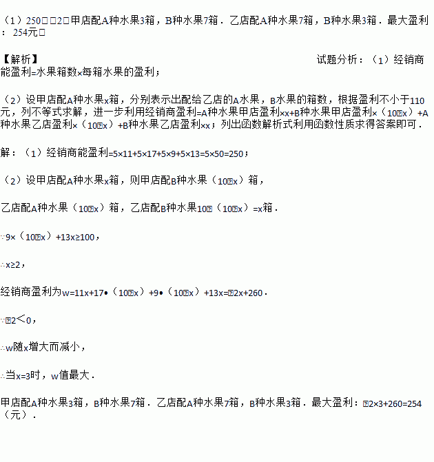 (1)如果甲、乙两店各配货10箱,其中A种水果两店各5箱,B种水果两店各5箱,请你计算出经销商能盈利多少元?