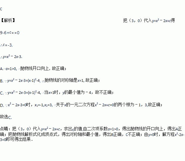 若抛物线y=x2﹣2x+c与x轴的一个交点为(3,0),则下列说法不正确的是( )