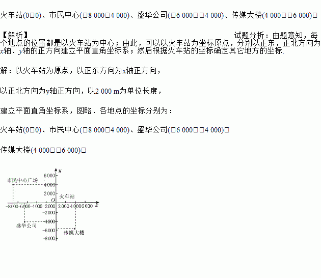 在某城市中,市民中心在火车站以西8 000 m再往北4 000 m处,盛华公司在火车站以西6 000 m再往南4 000 m处,传媒大楼在火车站以南6 000 m再往东4 000 m处.请建立适当的平面直角坐标系,分别写出各地点的坐标.