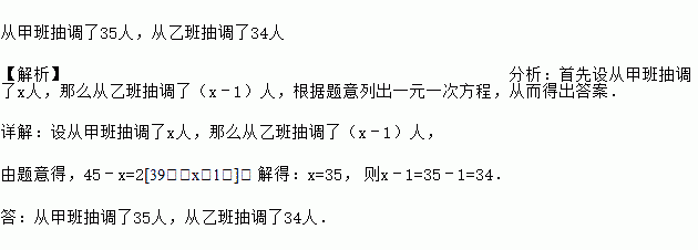 甲班有45人,乙班有39人.现在需要从甲、乙班各抽调一些同学去参加歌咏比赛.如果从甲班抽调的人数比乙班多1人,那么甲班剩余人数恰好是乙班剩余人数的2倍.请问从甲、乙两班各抽调了多少人参加歌咏比赛?