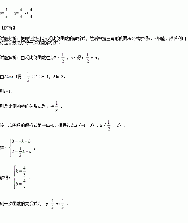 如图,在平面直角坐标系中,一次函数y=kx+b的图象与x轴交于点A(-1,0),与反比例函数y=在第一象限内的图象交于点B(,n).连结OB,若S△AOB=1.求反比例函数及一次函数的关系式.