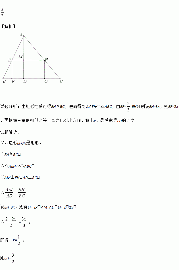 如图,矩形EFGH内接于△ABC,且边FG落在BC上,若AD⊥BC,BC=3,AD=2,EF=EH,求EH的长.