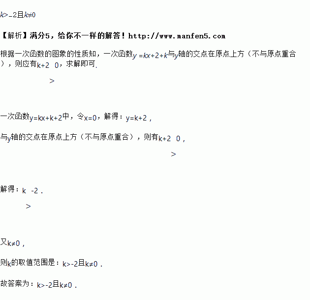一次函数y =kx+2+k与y轴的交点在原点上方(不与原点重合),则k的取值范围是_______.