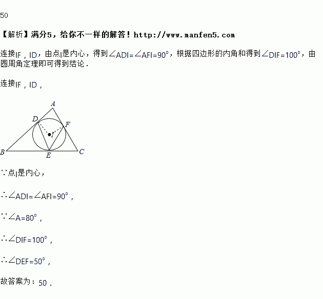 在△ABC中,点I是内心,若∠A=80°,则∠DEF=________度.