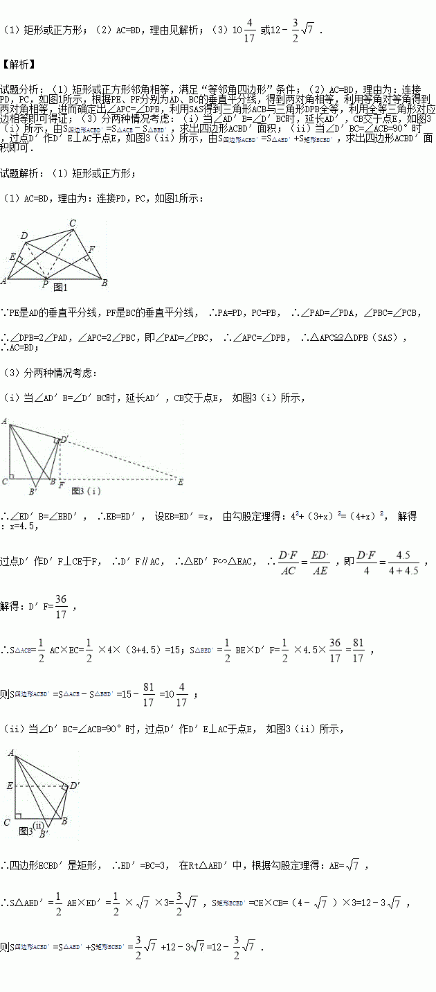 如图1,在等邻角四边形ABCD中,∠DAB=∠ABC,AD,BC的中垂线恰好交于AB边上一点P,连结AC,BD,试探究AC与BD的数量关系,并说明理由;