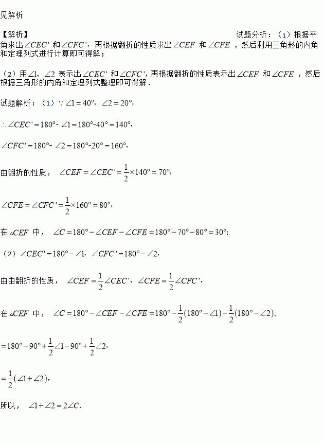 (1)若∠1=40°,∠2=20°,求∠C;