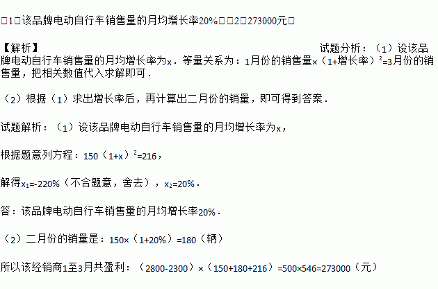 (1)该品牌电动自行车销售量的月均增长率20%;(2)273000元. 【解析】试题分析:(1)设该品牌电动自行车销售量的月均增长率为x.等量关系为:1月份的销售量×(1+增长率)2=3月份的销售量,把相关数值代入求解即可. (2)根据(1)求出增长率后,再计算出二月份的销量,即可得到答案. 试题解析:(1)设该品牌电动自行车销售量的月均增长率为x, 根据题意列方程:150...