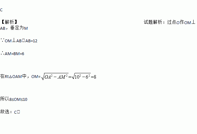 如图,已知⊙O的半径为10,弦AB=12,M是AB上任意一点,则线段OM的长可能是( )