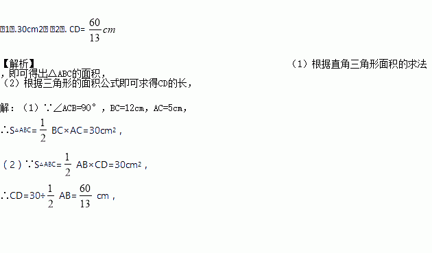 如图,在直角三角形ABC中,∠ACB=90°,CD是AB边上的高,AB=13cm,BC=12cm,AC=5cm,求(1)△ABC的面积;(2)CD的长。
