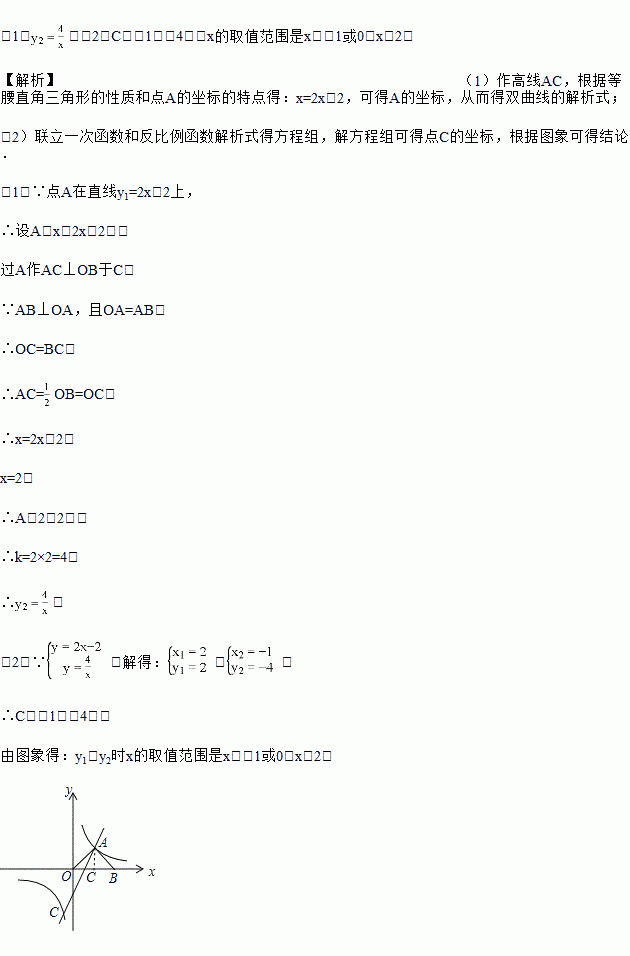 如图,在平面直角坐标系中,直线y1=2x﹣2与双曲线y2=交于A、C两点,AB⊥OA交x轴于点B,且OA=AB.