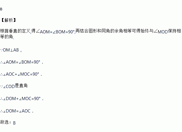 直线AB上有一点O,OM⊥AB于O,另有直角∠COD在平角∠AOB内绕O点左右摆动(OC与OA、OD与OB不重合),在摆动时,始终与∠MOD保持相等的角是( )
