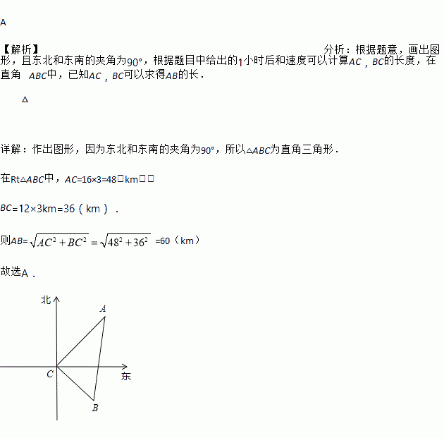 一艘轮船以16海里/时的速度离开港口向东南方向航行,另一艘轮船在同时同地以12海里/时的速度向西南方向航行,它们离开港口3小时相距( )海里.