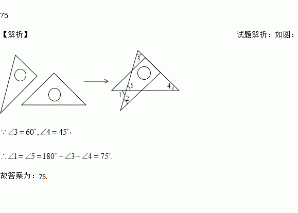 将一副直角三角板如图放置,使含30°角的三角板的直角边和含45°角的三角板的一条直角边重合,则∠1的度数为_____度.