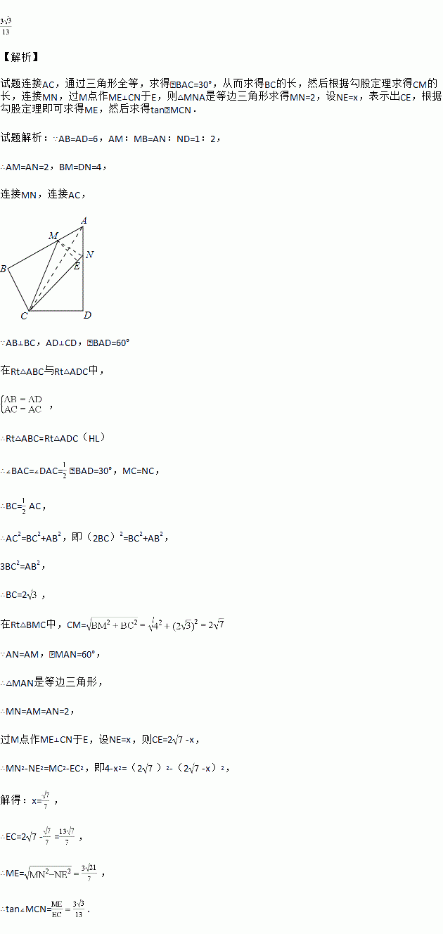 如图,在四边形ABCD中,AB=AD=6,AB⊥BC,AD⊥CD,∠BAD=60°,点M、N分别在AB、AD边上,若AM:MB=AN:ND=1:2.则 cos∠MCN=________.