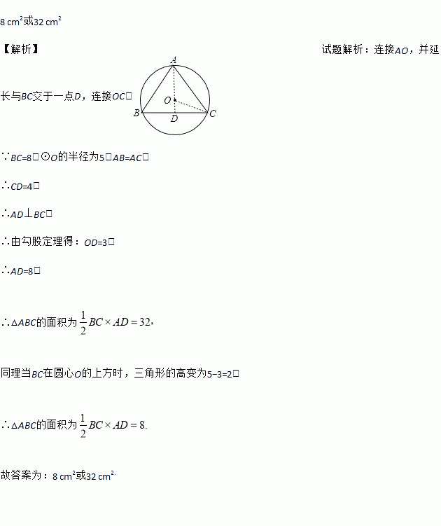 等腰三角形ABC内接于半径为5 cm的⊙O,若底边BC=8 cm,则△ABC的面积是 .