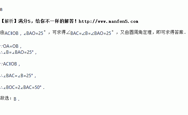 如图,在⊙O中,AC∥OB,∠BAO=25°,则∠BOC的度数为( )