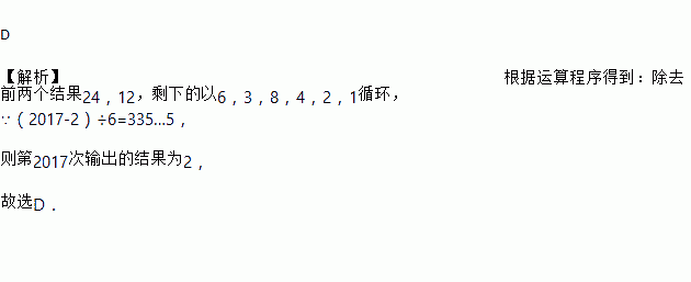 D 【解析】根据运算程序得到:除去前两个结果24,12,剩下的以6,3,8,4,2,1循环, ∵(2017-2)÷6=335…5, 则第2017次输出的结果为2, 故选D.