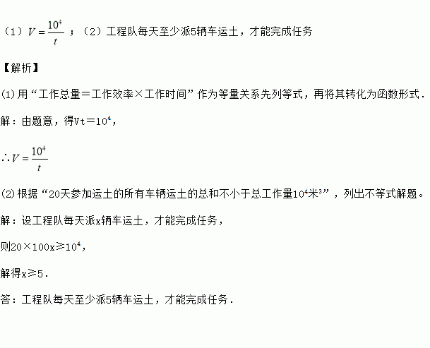 (2)该工程队共有10辆运输车,每辆车每天运土100米3,若工程必须在20天内完成任务,问:工程队每天至少派多少辆车运土,才能完成任务?