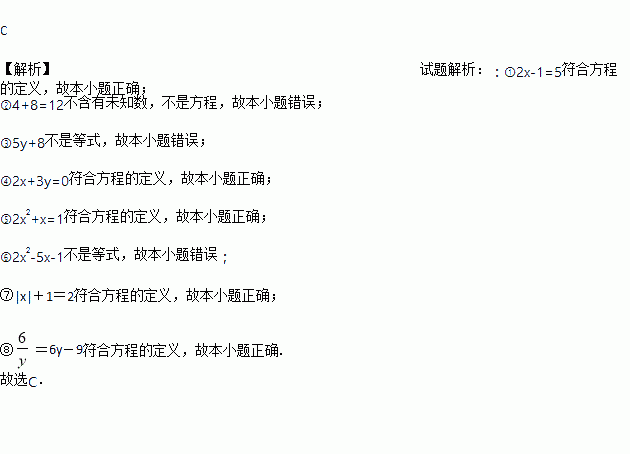 下列各式中:①2x-1=5;②4+8=12;③5y+8;④2x+3y=0;⑤2x2+x=1;⑥2x2-5x-1;⑦|x|+1=2;⑧