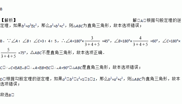 B 【解析】解:A.根据勾股定理的逆定理,如果b2=a2﹣c2,那么a2=b2+c2,则△ABC为直角三角形,故本选项错误; B.∵∠A:∠B:∠C=3:4:5,∴∠A=180°×=45°,∠B=180°×=60°,∠C=180°×=75°,△ABC不是直角三角形,故本选项正确. C.∵∠C=∠A﹣∠B,∴∠A=∠B+∠C,∴∠A=90°,△ABC是直角三角形,故本选项错误; ...