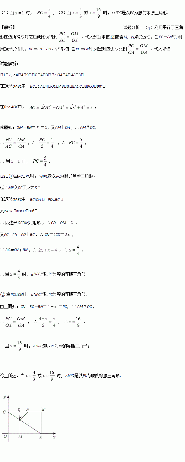 查看答案如图,矩形OABC的顶点A,B的坐标分别为(4,0),(4,3),动点M,N分别从O,B同时出发.以每秒1个单位的速度运动.其中,点M沿OA向终点A运动,点N沿BC向终点C运动.过点M作MP⊥OA,交AC于P,连接NP,已知动点运动了