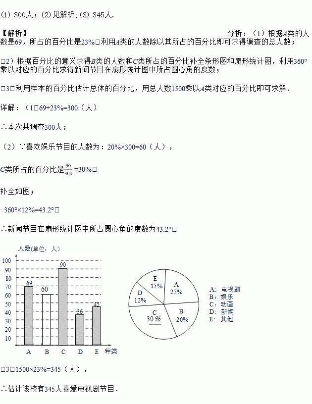 (3)若该中学有1500名学生,请估计该校喜爱电视剧节目的人数.
