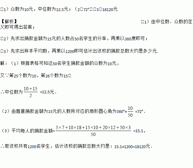 (2)如果把这50名学生的捐款情况绘制成扇形统计图,则捐款金额为15元的人数所对应的扇形圆心角为多少度?