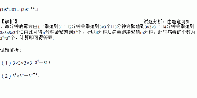 试问:经过4分钟,1个病毒会繁殖到多少个?若这些病毒继续繁殖,m分钟后会繁殖到多少个?