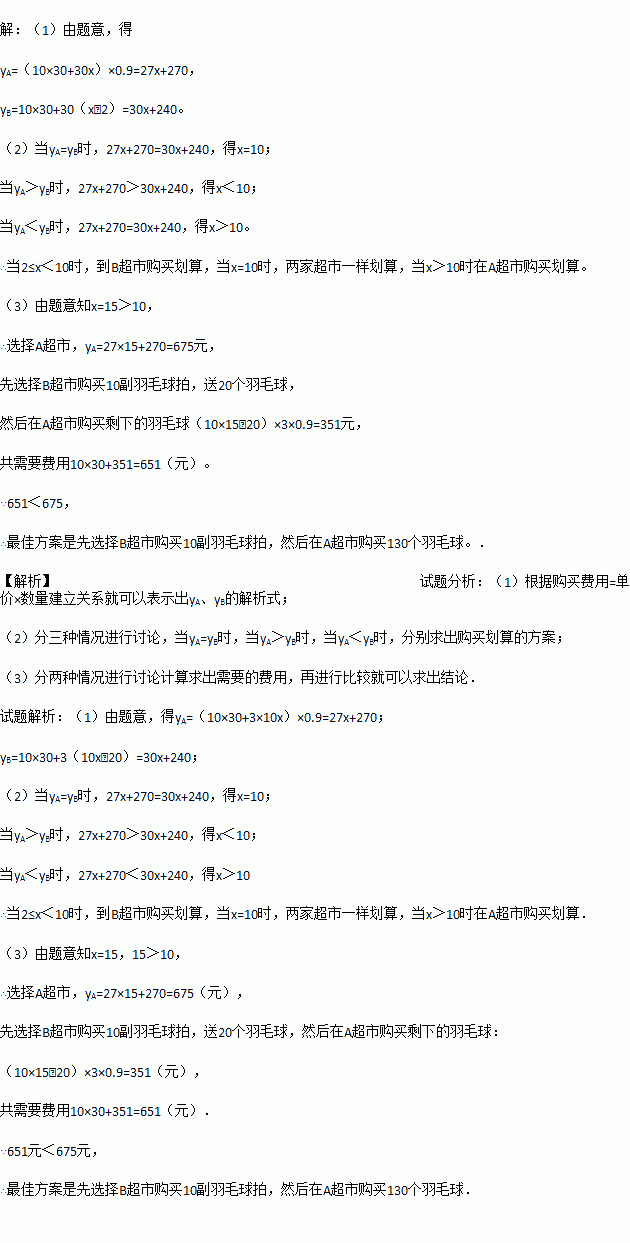某社区活动中心为鼓励居民加强体育锻炼,准备购买10副某种品牌的羽毛球拍,每副球拍配x(x≥2)个羽毛球,供社区居民免费借用.该社区附近A、B两家超市都有这种品牌的羽毛球拍和羽毛球出售,且每副球拍的标价均为30元,每个羽毛球的标价为3元,目前两家超市同时在做促销活动: