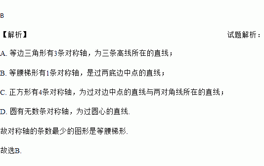 如图,已知四个图形分别是等边三角形、等腰梯形、正方形、圆,它们全是轴对称图形,其中对称轴的条数最少的图形是( )