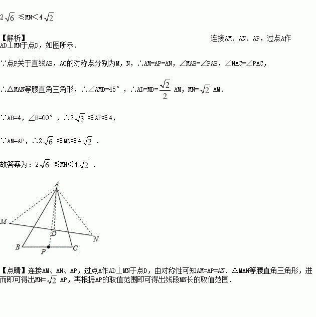 如图,在△ABC中,∠A=45°,∠B=60°,AB=4,P是BC边上的动点(不与B,C重合),点P关于直线AB,AC的对称点分别为M,N,则线段MN长的取值范围是________.