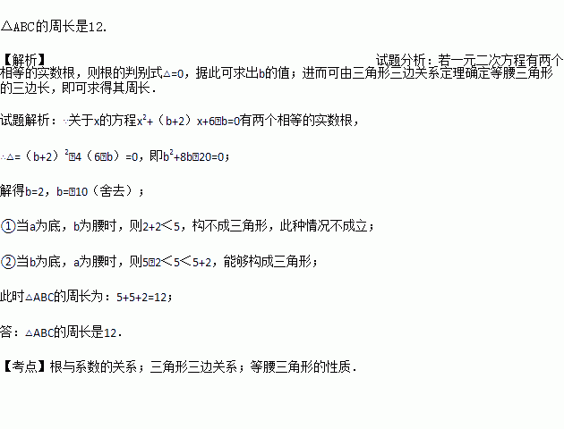 在等腰△ABC中,三边分别为a、b、c,其中,若关于x的方程有两个相等的实数根,求△ABC的周长.
