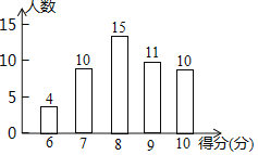 为了了解居民的环保意识,社区工作人员在光明小区随机抽取了若干名居民开展主题为“打赢蓝天保卫战”的环保知识有奖问答活动,并用得到的数据绘制了如图条形统计图(得分为整数,满分为10分,最低分为6分)