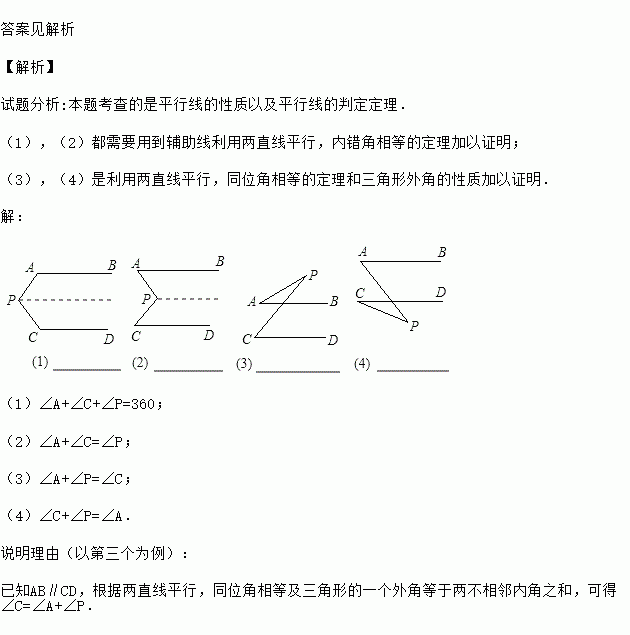 如图所示,已知AB∥CD,分别探索下列四个图形中∠P与∠A,∠C的关系,请你从所得的四个关系中任选一个加以说明.