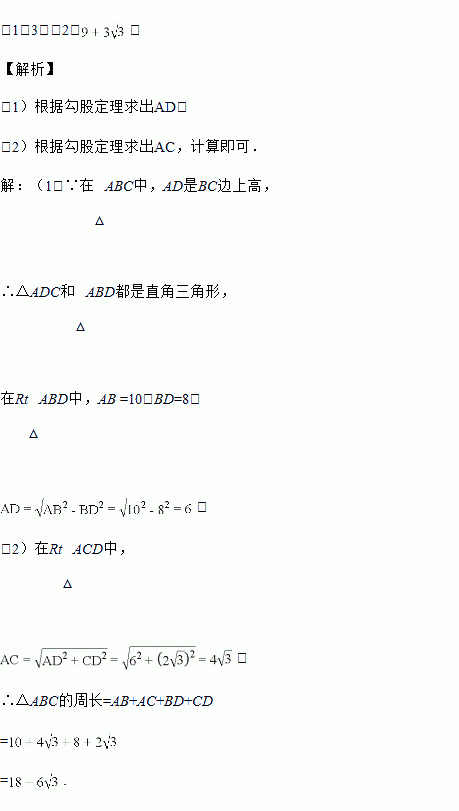 如图,在△ABC中,AD⊥BC,AB=10,BD=8,CD=2.