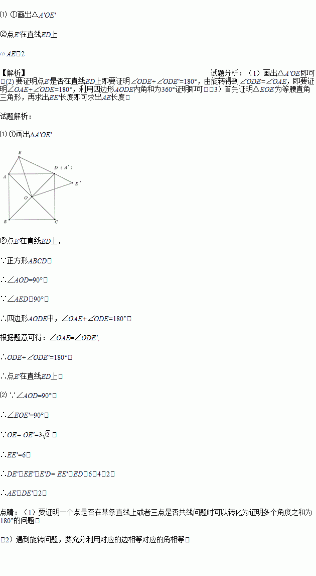①画出△A'OE';②判断点E'是否在直线ED上,并说明理由;