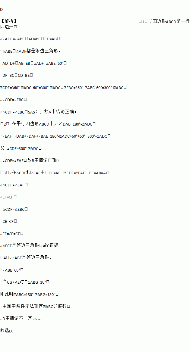 如图,已知在?ABCD中,分别以AB,AD为边分别向外作等边三角形ABE和等边三角形ADF,延长CB交AE于点G,点G在点A,E之间,连接CE,CF,EF,则下列结论不一定正确的是( )