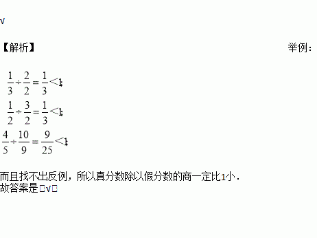 真分数除以假分数的商一定比1小。( )