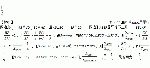 如图,?ABCD中,点E、F分别在BC,AD上,且BE:EC=2:1,EF∥CD,交对角线AC于点G,则=_____.