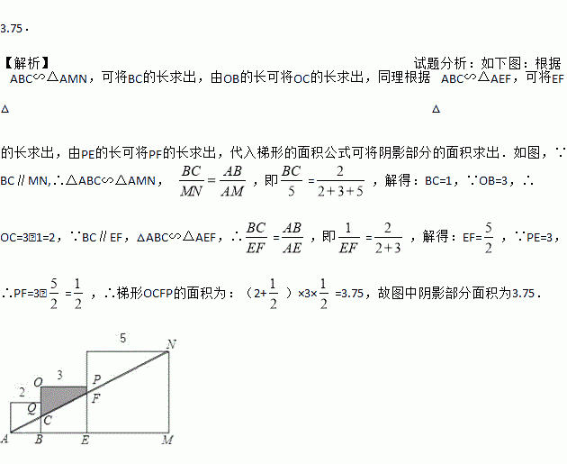 已知三个边长分别为2、3、5的正方形如图排列,则图中阴影部分面积为 .