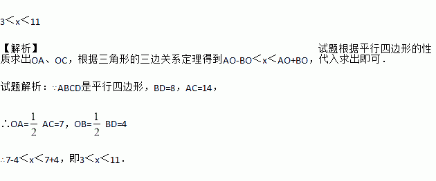 如图,在□ABCD中,对角线AC、BD相交于点O.如果AC=14,BD=8,AB=x,那么x的取值范围是______________.