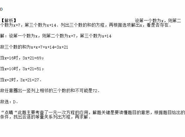 D 【解析】设第一个数为x,则第二个数为x+7,第三个数为x+14.列出三个数的和的方程,再根据选项解出x,看是否存在. 【解析】 设第一个数为x,则第二个数为x+7,第三个数为x+14 故三个数的和为x+x+7+x+14=3x+21 当x=16时,3x+21=69; 当x=10时,3x+21=51; 当x=2时,3x+21=27. 故任意圈出一竖列上相...