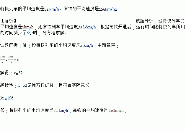 2018年6月28日,深湛高铁正式运营.从湛江到广州全程约468km,高铁开通后,运行时间比特快列车所用的时间减少了6h.若高铁列车的平均速度是特快列车平均速度的3倍,求特快列车与高铁的平均速度.